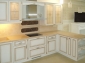 Кухня имеет П-образную планировку. Фасады и декоративные элементы с золотой патиной. Столешница искусственный камень. Фурнитура BLUM (Австрия).