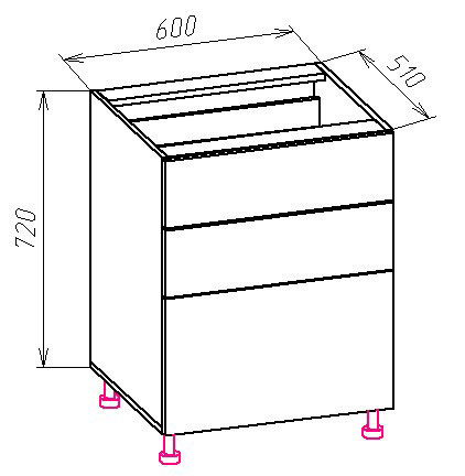 Стол с тремя ящиками метабокс Blum. Высота 720 мм, ширина 600мм, глубина 510 мм. Стоимость: * без фасадов – 4901 руб. * с фасадами из ЛДСП к ПВХ кромке 2 мм –5463 руб. * с фасадами МДФ в глянцевой пленке ПВХ – 6164 руб. * с фасадами МДФ + матовая эмаль – 6738 руб.